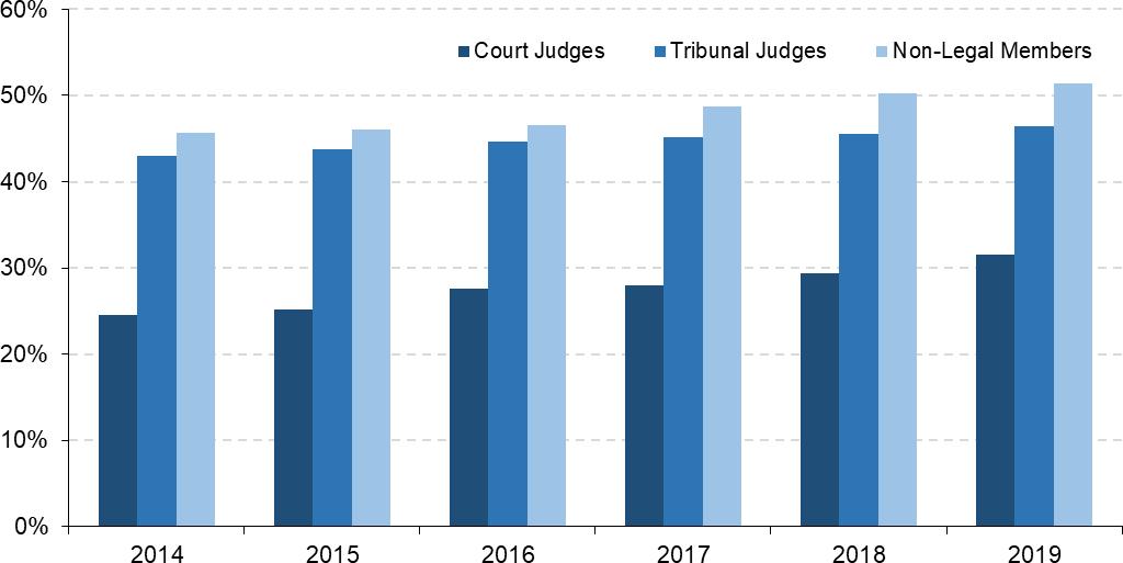 从2014年到2019年,英国女法官的比例从24%上升到32%。截至2019年4月1日,约有一半(51%)非专业成员为女性,32%的法院法官和46%的民事调解员*为女性。