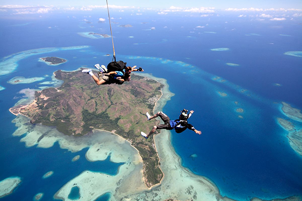 据说斐济的大海有七种颜色,这里的珊瑚礁也是世界上第二大的,而能欣赏这一切风景的最佳地就是在空中。直升机跳伞是斐济非常受欢迎的体验,有从8000英尺到14000英尺的四个高度选择。