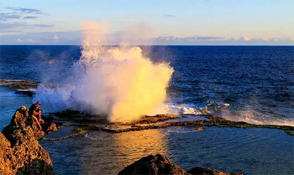 只有在汤加能够看到的“海上喷泉”,每个游人都不会错过。在汤加塔布群岛,海岸上有许多珊瑚礁形成的孔洞,当海浪拍来,就形成了很高的水柱并冲向天空,同时发出“呜呜”的声响,颇为壮观。