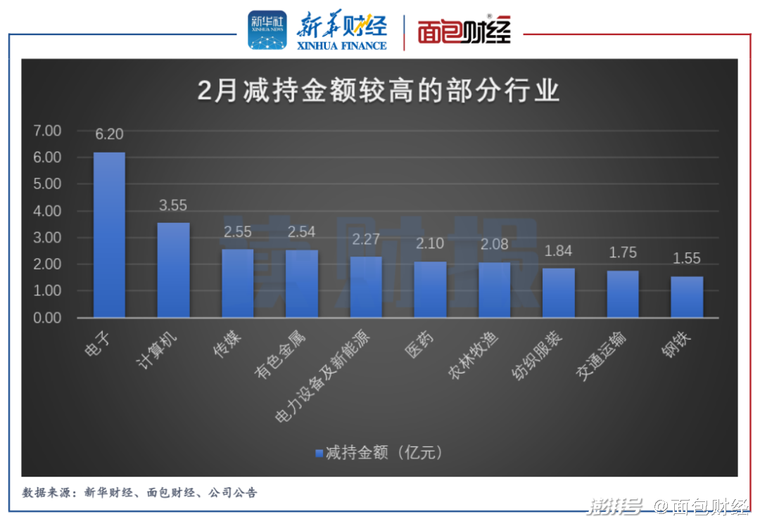新华财经和面包财经根据上市公司的信披数据统计,2022年2月,沪深两市上市公司董监高及其关联人减持金额合计约34.13亿元,涉及128家公司;增持金额合计约1.82亿元,涉及38家公司。增、减持金额相抵之后,净减持金额32.31亿元。2月,各行业中电子行业减持金额居首位,电力设备及新能源行业增持金额最多。