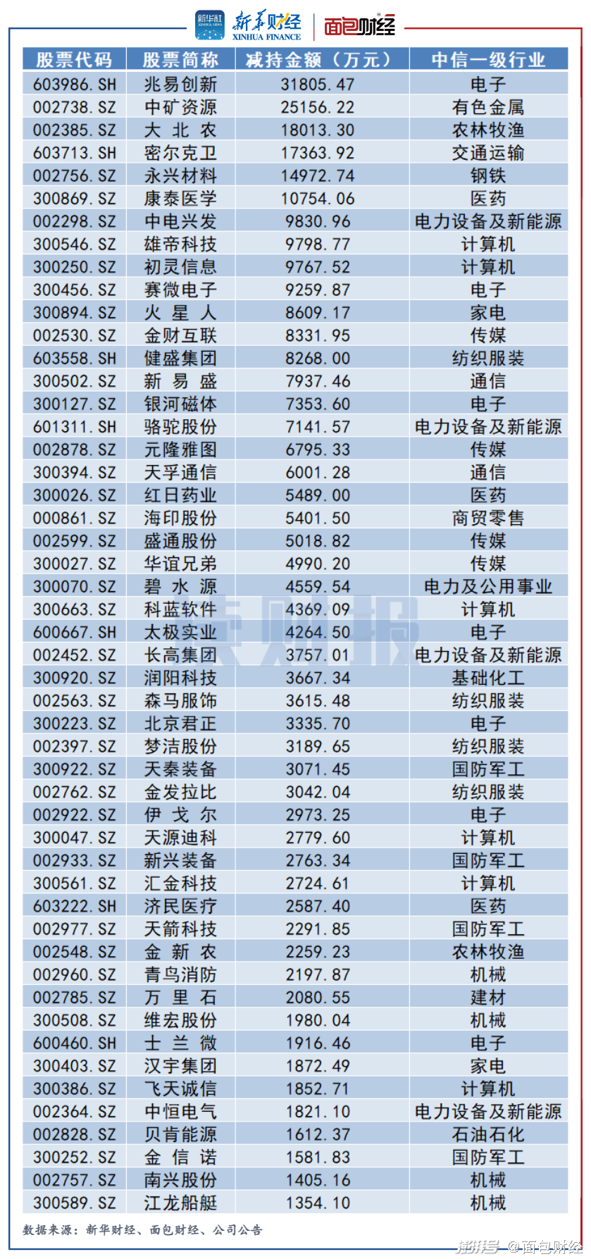 图3:2022年2月董监高及其关联人减持总金额排名前50的公司个股来看,兆易创新减持金额居首,中矿资源排在第二位,大北农位于第三位。其中,中矿资源董事孙梅春在2月累计减持金额为2.52亿元,大北农董事邵根伙在2月份累计减持金额为1.8亿元。另外,密尔克卫、永兴材料及康泰医学减持金额同样居前。数据显示,密尔克卫董事陈银河在2月累计减持金额为1.74亿元,永兴材料2位董监高在2月合计减持金额为1.5亿元,康泰医学3董事在2月合计减持金额为1.08亿元。