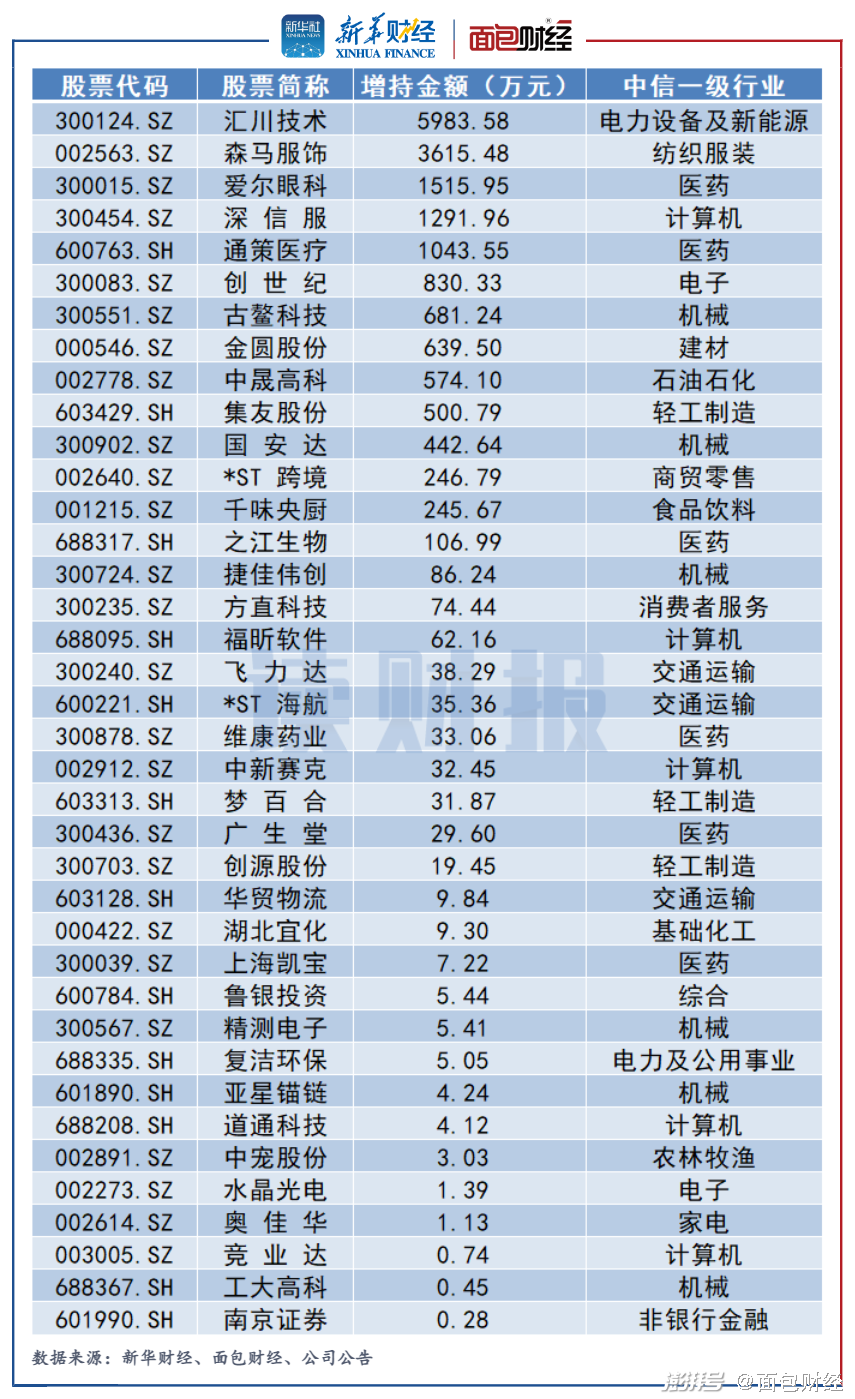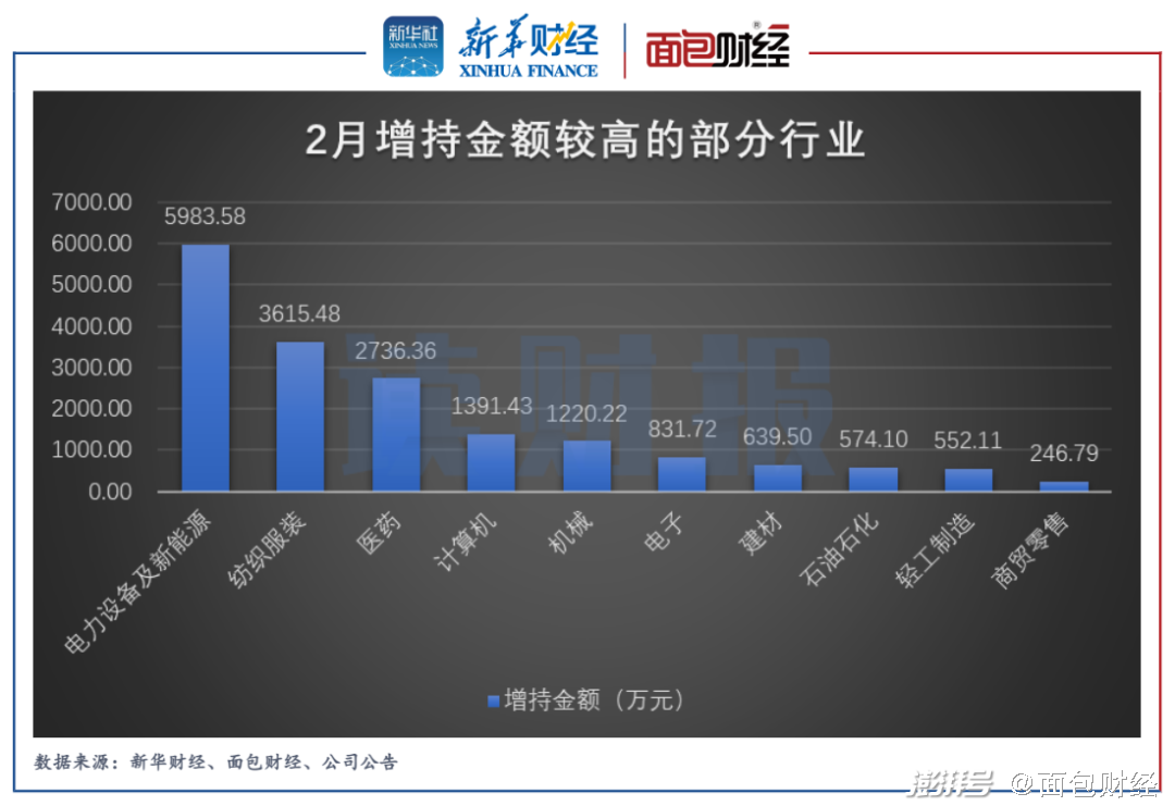 纺织服装行业中,增持金额来自森马服饰。数据显示,森马服饰3位董监高在2月合计增持了3615.48万元。