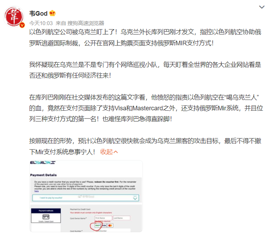 3月8日,有微博网友发文表示,“以色列航空公司被乌克兰盯上了。”以航“支持俄罗斯Mir支付系统,并且位列支付方式的第一名”。