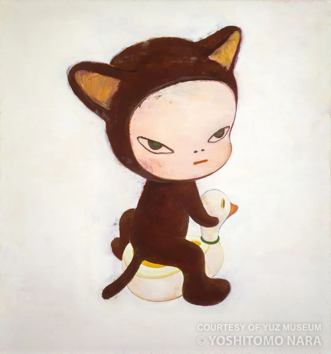 奈良美智(Yoshitomo Nara)⽣于 1959 年,在青森县弘前市长⼤。1987 年,他从⽇本长久⼿市爱知县⽴艺术与⾳乐⼤学获得美术硕⼠学位。1993 年,他在德国杜塞尔多夫艺术学院完成学业。奈良的职业⽣涯始于他在科隆度过的⼗年,从 20 世纪 90 年代中期开始,他的作品在欧洲、美国、⽇本和亚洲各地⼴泛展出。2000 年,他回到⽇本,恰逢全球对⽇本流⾏⽂化的兴趣激增,尤其是美国。虽然他主要是画家,但他的艺术实践也包括纸上绘画,⽤⽊头、玻璃钢、陶瓷和青铜制作的雕塑,运⽤废料搭建的装置作品,以及记录他旅途经历和⽇常风景的照⽚。