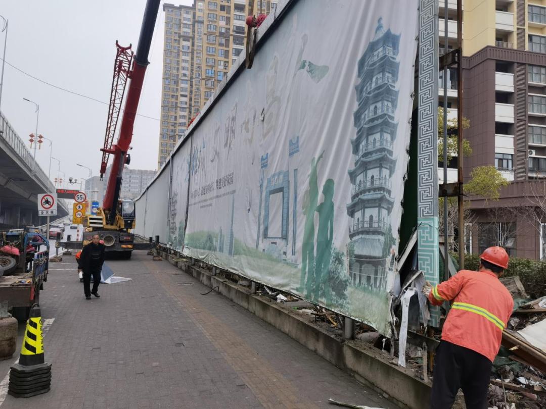 “决定拆除后,我们组织执法队员拉起警戒线,并请了专门的施工队伍,动用了吊车和氧割机,将这些巨型广告牌逐块拆除、吊起、清运。”彭家桥执法中队中队长仲从勇表示,此处广告牌高6米,长达400余米,在执法人员和施工人员紧密配合下,最终顺利完成了拆除工作。据了解