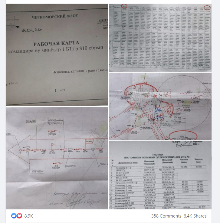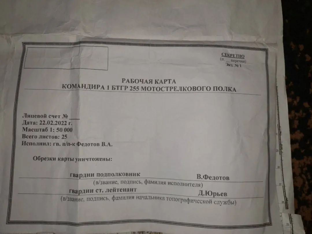 “是的,我们掌握了俄罗斯黑海舰队海军陆战队某营战术小组的计划文件,其中包括有工作地图、作战任务、呼号表、控制信号表、隐藏控制表、人员名单等。根据我们获得的信息,这些计划与乌克兰开战的文件在2022年1月18日已获批,并且(俄军)计划在15天内,即2月20日至3月6日,攻占乌克兰。