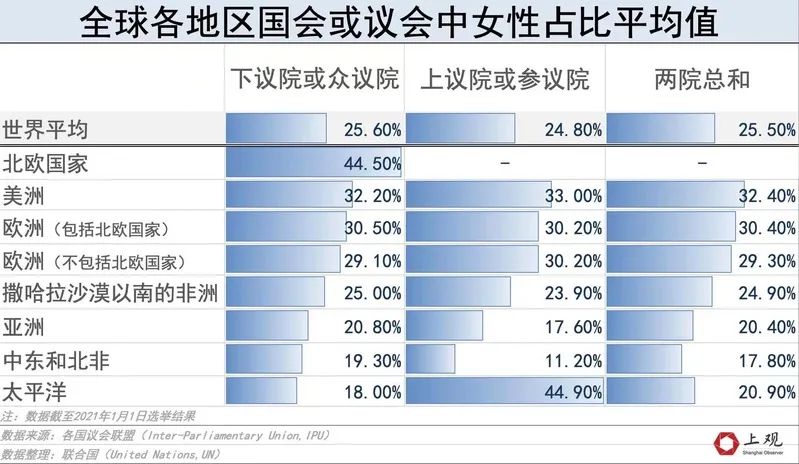 根据2021年联合国对全球190个国家及地区一院制议会中女性领导的比例统计,女性进入上议院最多的是太平洋地区(44.9%),进入下议院最多的是北欧地区(44.5%)。