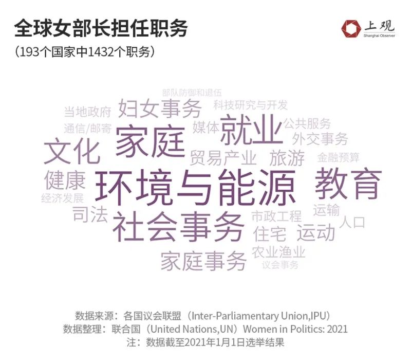 “环境与能源”是全球女性部级领导任职最多的领域,其次是“社会事务”和“家庭、孩子、老年人和残疾人”。