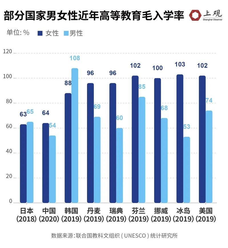 女性领导占比较高的北欧五国,女性的高等教育毛入学率在全球名列前茅,其中冰岛的毛入学率高达103%。