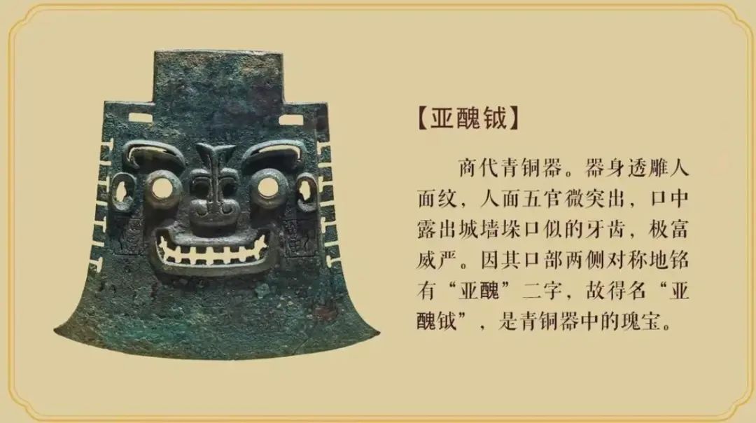 青铜器自古以来都是“国之重器”,也是权力和地位的象征,非常珍贵。亚醜钺为方内,双穿,两肩有棱,器身透雕人面纹,人面五官微突出,双目圆睁,嘴角上扬,口中露出城墙垛口似的牙齿,极富威严。因其口部两侧对称地铭有“亚醜”二字,故得名“亚醜钺”。