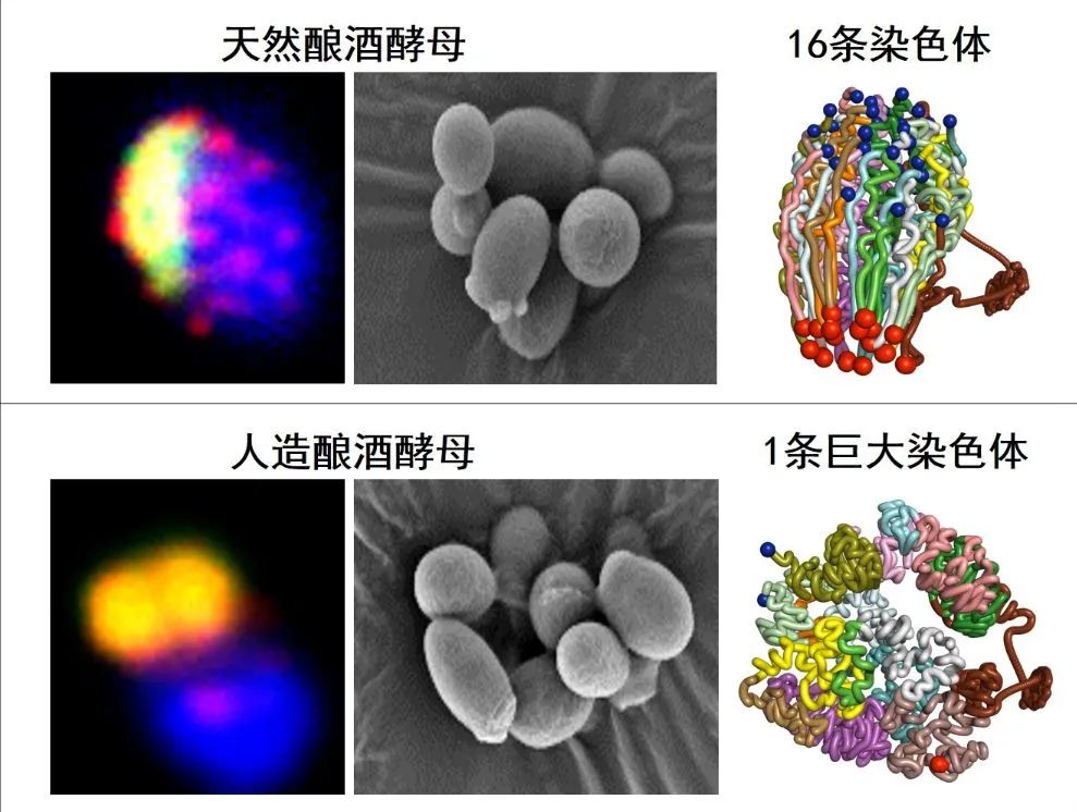 可以看到虽然染色体数量不一样,但是人造的酿酒酵母形态结构上和真正的酿酒酵母基本一致| 图源:覃重军实验室