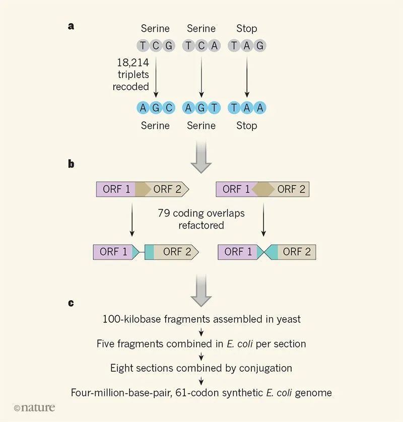Fredens J, Wang K, de la Torre D, et al. Total synthesis of Escherichia coli with a recoded genome[J]. Nature, 2019, 569(7757): 514-518.