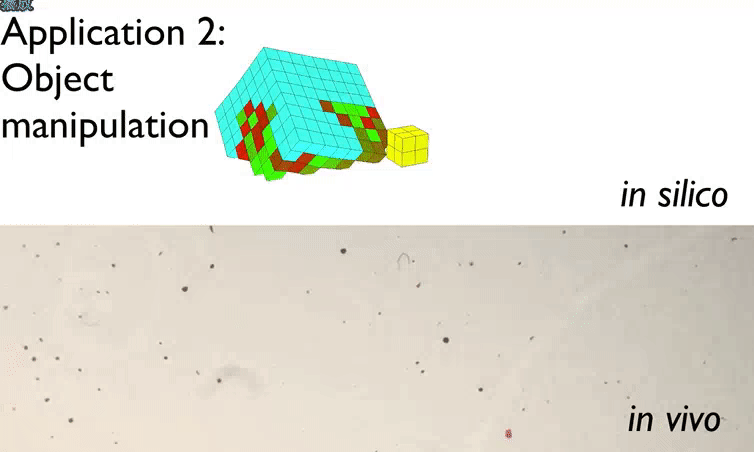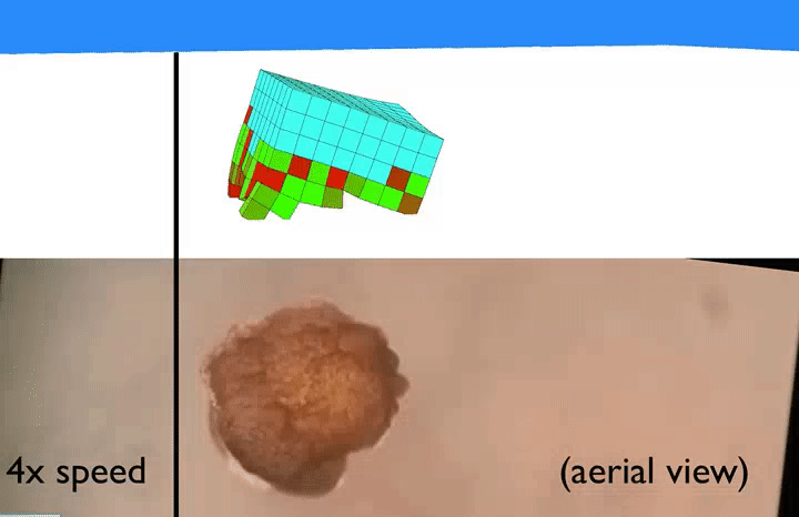 2020年,计算科学家和生物学家之间的合作,制作出了由多细胞构成的“生物机器人”:通过类似进化的算法(evolutionary algorithm)反复模拟尝试,计算科学家设计出了由收缩细胞和被动细胞组成的生物体结构。