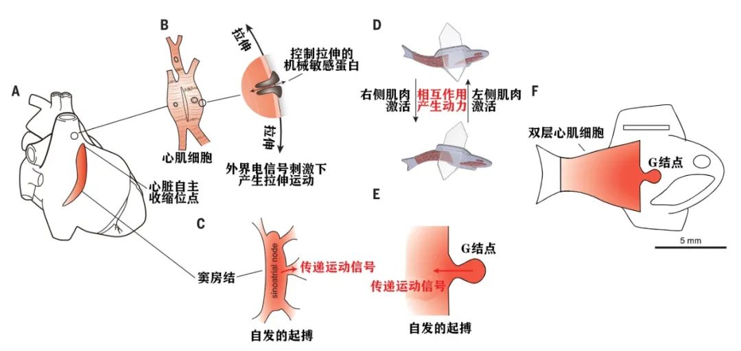 人造小鱼的设计过程,通过心脏的构造(图A-C),分别设计出左右相互作用的肌肉(图D)和可以发出自发启播信号的G结点(G-node,图E) | 图源:Lee K Y, et al. Science, 2022.这个人造小鱼不仅可以自由运动,它的运动效率甚至远超普通的鱼类,同时还能保持将近三个月的持续游动(相当于心肌细胞跳动了3800万次)。