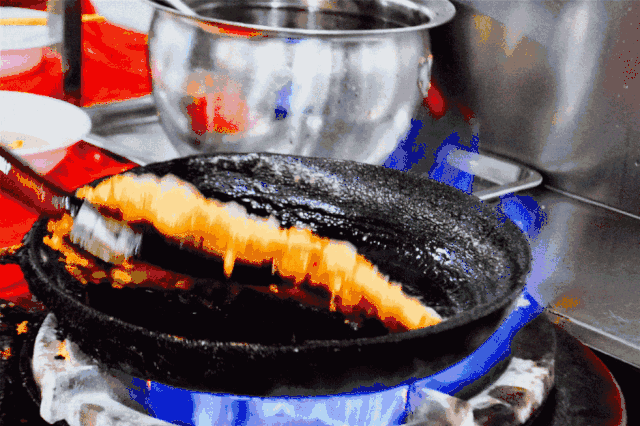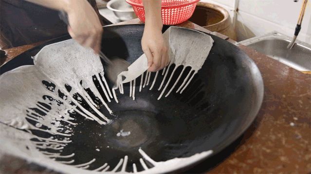 烧有开水的铁锅边缓缓浇一圈米浆,然后用铲子一铲,下大勺一捞,就是一碗锅边糊。