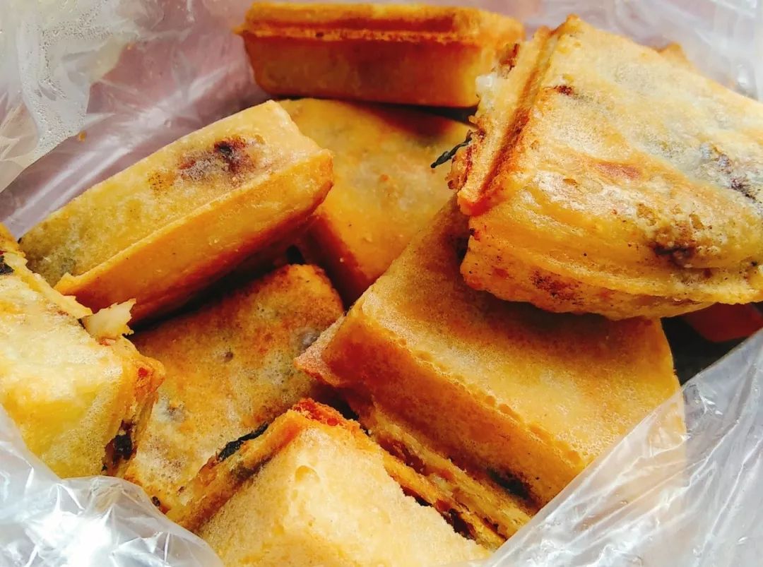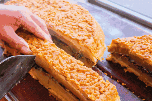吃三角饼总共有三个步骤。第一口吃酥松表皮。第二口吃满足的馅料。第三口便能仔细品尝其中的滋味。三角饼一定要趁热吃,每一口都值得细细品尝。