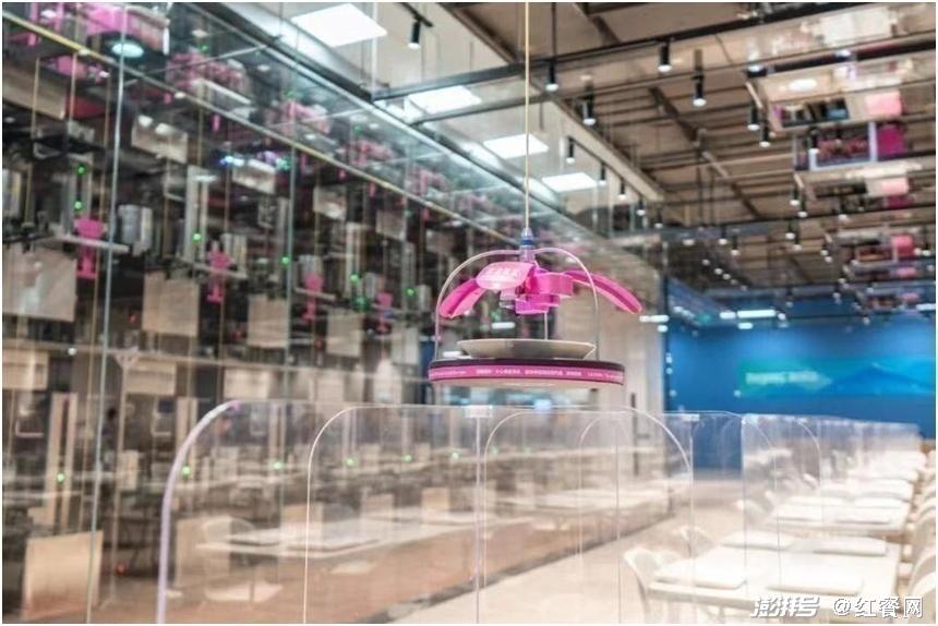 这家餐厅有三个分区,即中餐区、火锅区、快餐区,全都由机器人下单、炒菜、送菜。比如在中餐区,客人扫码点单后,系统会自动发出指令;机械臂、机器炒锅就会进行烹饪;完成的菜品将由AGV送菜小车,在天花板的云轨上传送至用户位置。