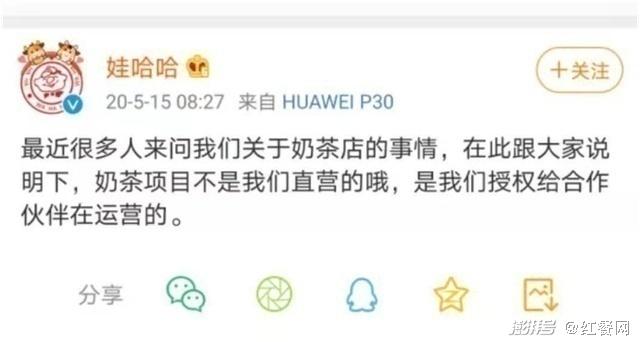 起初在大众消费者和加盟者眼中,“娃哈哈奶茶”和“娃哈哈”这两个品牌是有直接的关联。但是,2020年5月15日,“娃哈哈”在官方微博发布了一条澄清信息,“奶茶项目不是直营的,是授权给合作伙伴(广州娃哈哈)在运营”。