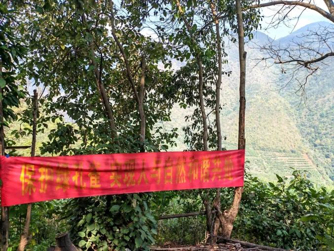 太阳渐渐落山时,走到了山路的尽头,记者也终于看见了路边上的几幢小木屋。“新平县腰村绿孔雀栖息地(共同)管护区 未经许可 严禁进入”几行大字印在路边的指示牌上,“保护绿孔雀 实现人与自然和谐共处”的红色横幅在这漫山遍野的树中,也显得格外显眼。管护区小木屋内没有工作人员,得不到继续深入的许可,记者只好就此止步。未能亲睹绿孔雀的芳姿,不免心中怅然,但环顾四周,这里人迹罕至,遥望戛洒江,像一束红丝绒在阳光下灿然闪烁,流淌在两岸葳蕤之间,心中又油然升起一股欣慰。