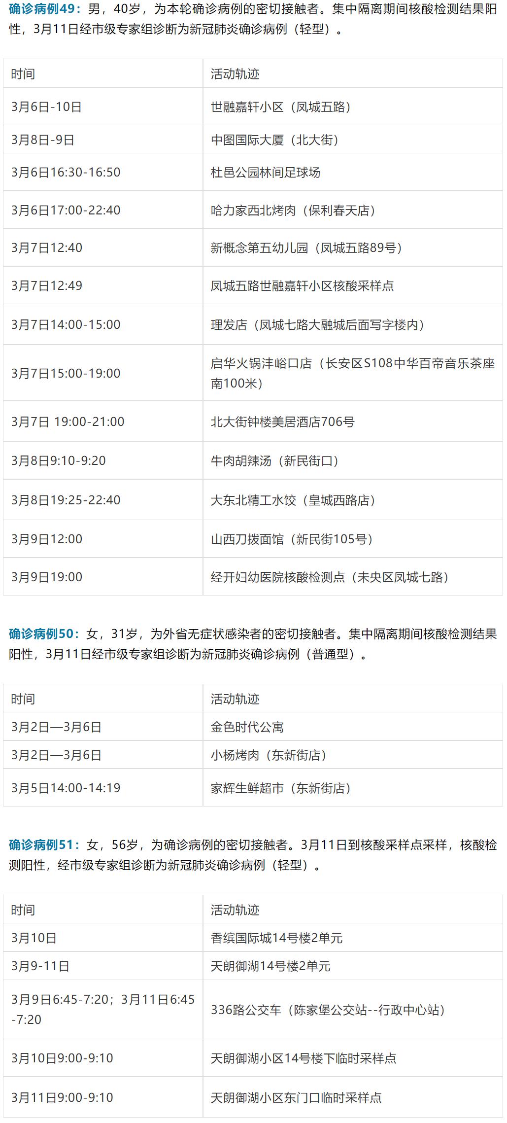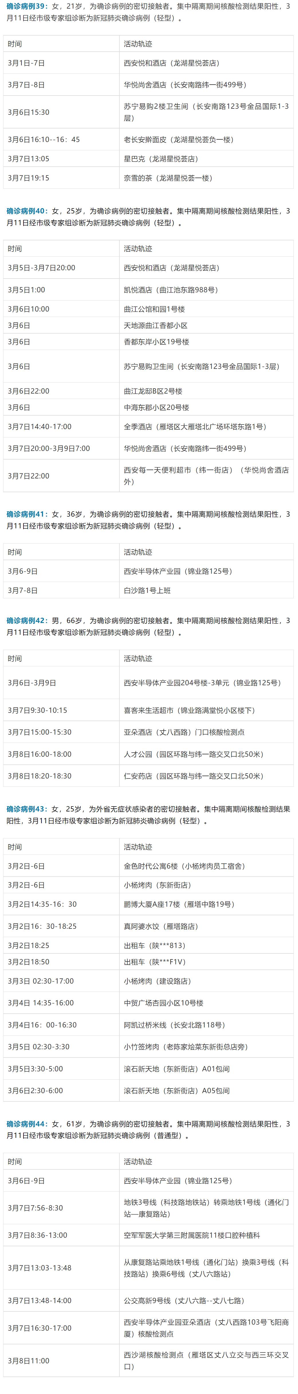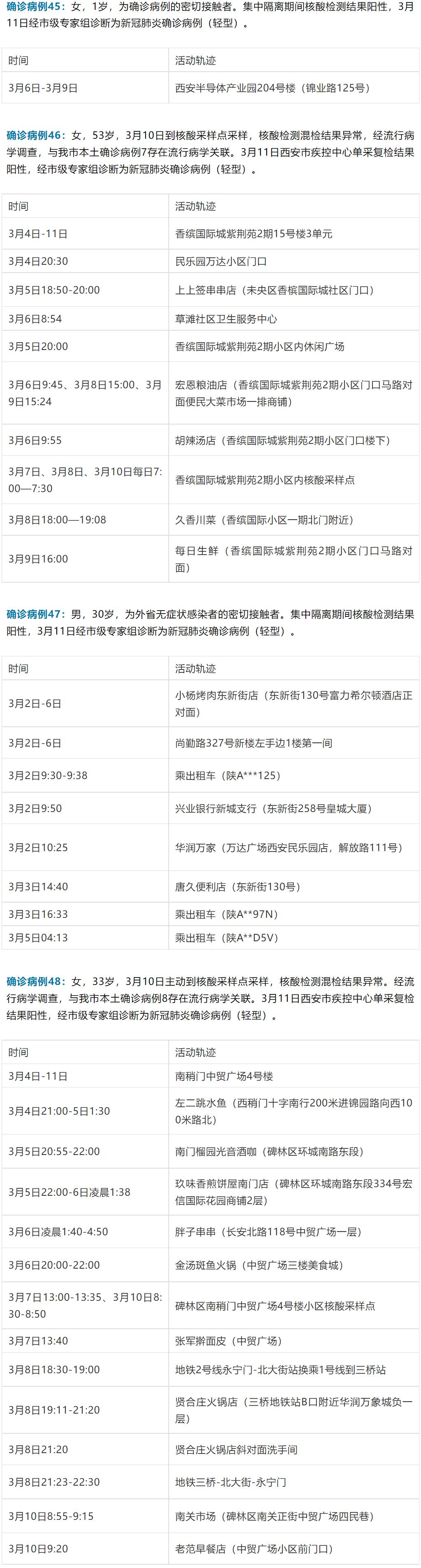 ▲根据流调情况,3月11日0时-24时西安市新增13例本土确诊病例(11例轻型,2例普通型),10例集中隔离发现,3例主动核酸检测发现,经流行病学调查,均与既往病例存在流行病学关联,现将主要活动轨迹公布如下(未公布的时间段尚未发现有公共场所活动轨迹)↓