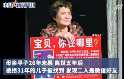 ▲近日,寻子26年的母亲杨素慧其儿子徐剑锋经公安采血确认被找到,双方曾因胎记位置不符错过相认。1991年,杨素慧4岁的儿子于广州南方大厦被拐后,母亲为寻子独自留在广州打工,经历离婚、身患癌症仍坚持寻亲。据寻亲志愿者燕子称,2016年杨阿姨的事迹经过媒体报道,曾收到大量认亲消息,其中就有如今的儿子徐剑锋,他看到报道曾加上母亲微信,但当时因胎记位置不符双方错过相认。2017年,未找到儿子的母亲抱憾去世,儿子曾在朋友圈留言:阿姨,一路走好。