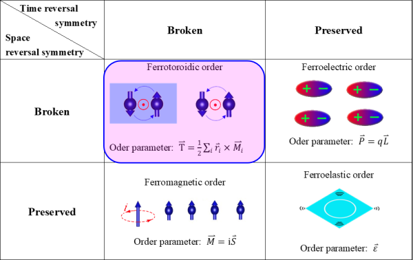 图1 铁涡序(左上)、铁电序(右上)、铁磁序(左下)和铁弹序(右下)等四种基本铁性有序相变及相应的时空对称破缺