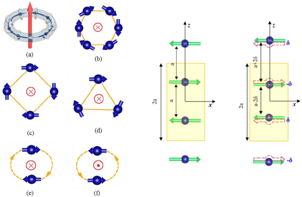 一维体系结构简单,物理图像简洁直观,易于构建理论模型。对于均匀排列的一维反铁磁链而言,结构二聚化将使得自旋反平行排列的一维自旋链【图2(h)】同时具有时间和空间反演对称性破缺,因此理论预言,该结构二聚化且自旋反平行排列的一维自旋链具有铁涡性质,并且两个反平行排列的自旋构成最简单的铁涡矩【图1(e,f)】。这种情况可以类比于正负电荷均匀排列的一维链:该电荷链不呈现净的电极化,但如果正负电荷链存在二聚化,空间反演对称性破缺,体系将呈现铁电性质。尽管理论早已提出该简单的一维铁涡链模型,但到目前仍为止未见实际材料报道。