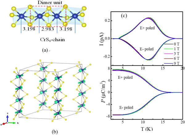 图3 (a)Ba6Cr2S10晶体结构中二聚化的CrS6自旋链 (b)Ba6Cr2S10磁结构 (c)电极化实验测量结果