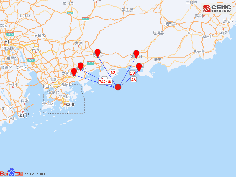 周边县城:震中距城区45公里、距海丰县59公里、距惠东县62公里、距惠阳区68公里、距坪山区74公里,距汕尾市46公里。