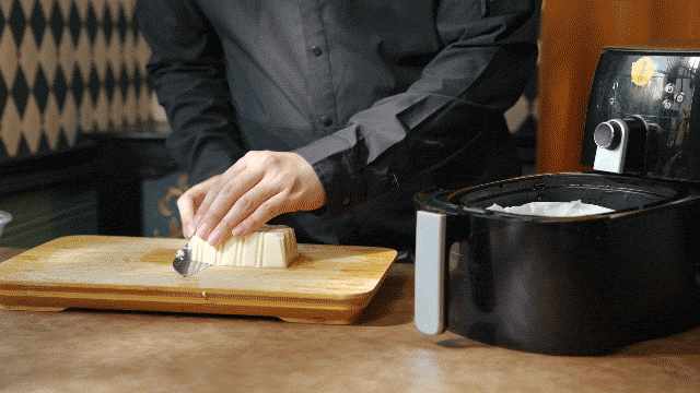 在空气炸锅中使用烘焙纸一定要注意,要将边缘压下去,高度不能超过炸篮。因为上面就是热管会烤焦,甚至有火灾风险,大家一定要注意。