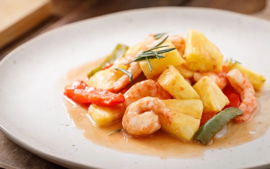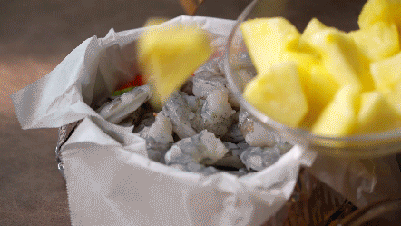 随后将红、绿甜椒、225克虾仁、200克菠萝一起放入铺了烘焙纸的锡纸盒,倒入糖醋汁,先200度8分钟,打开搅拌均匀后再200度4分钟即成。