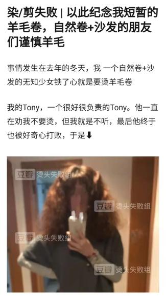 (图源豆瓣“豆瓣烫头失败组”)后知后觉,我才明白,每个人的发质、发量都不一样。光是发质,就有干性、油性、中性、混合型和受损发质等等,而发量就更是因人而异。发量多、发质硬的人可能更适合简单的造型,而“细软塌”发质的人烫起羊毛卷可能会更蓬松好看。