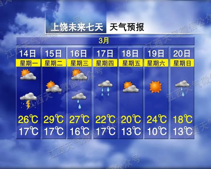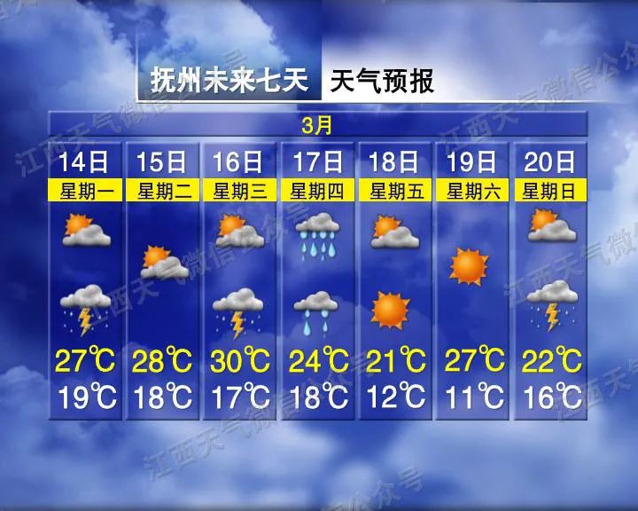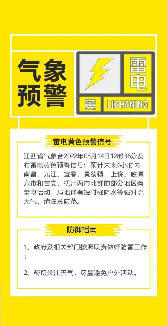 江西省气象台2022年03月14日12时36分发布雷电黄色预警信号:预计未来6小时内,南昌、九江、宜春、景德镇、上饶、鹰潭六市和吉安、抚州两市北部的部分地区有雷电活动,局地伴有短时强降水等强对流天气,请注意防范。