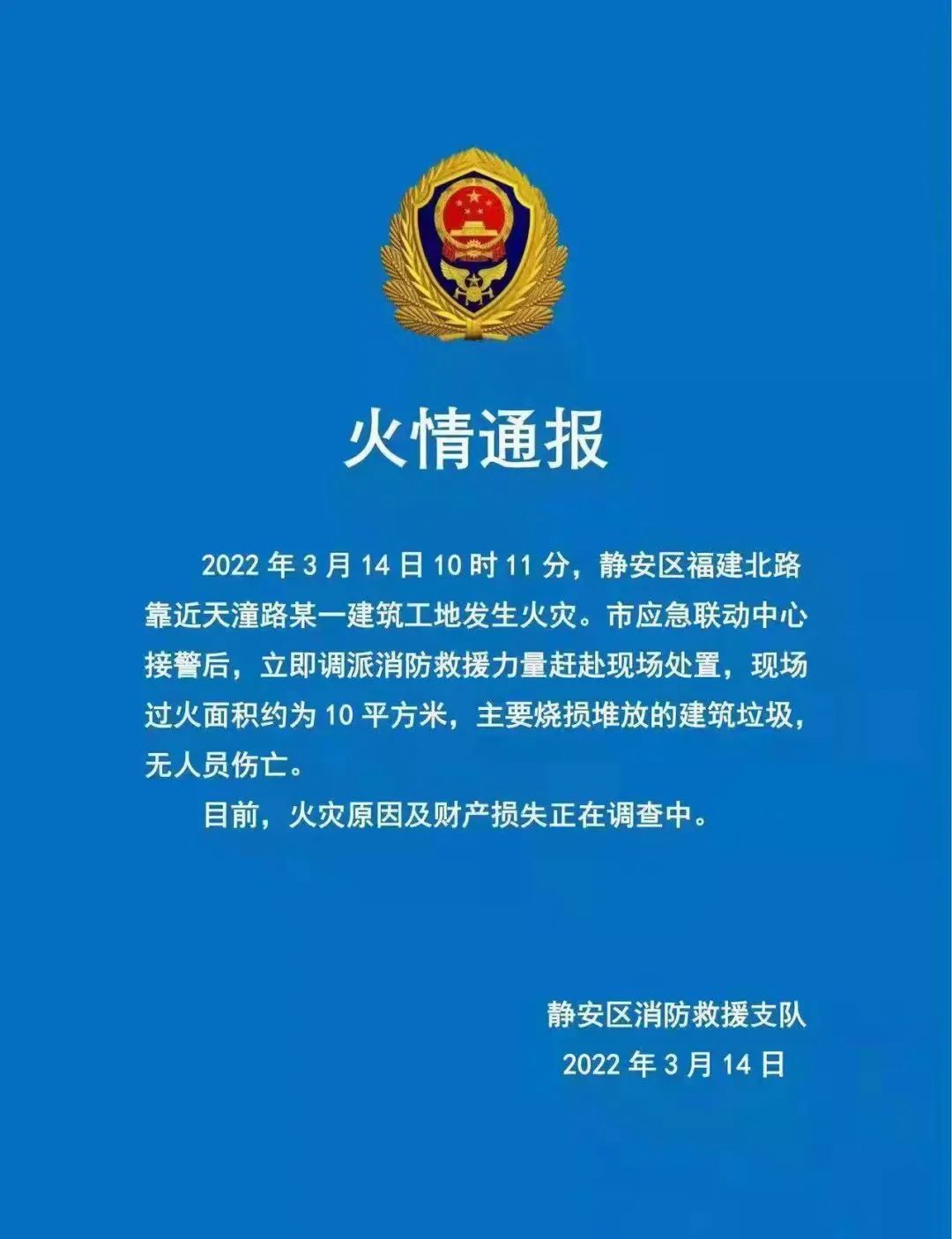 火情通报信息显示,现场过火面积约10平方米,主要烧损物为堆放的建筑垃圾,无人员伤亡,目前火灾原因及财产损失正在调查中。