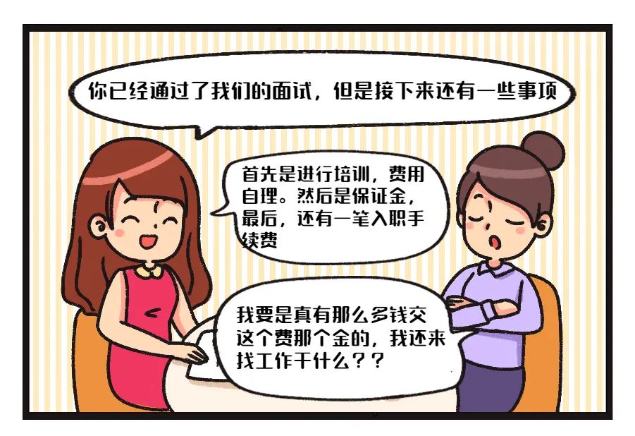 许多初入社会的小伙伴很可能遇到这样的骗局,但是,正规的公司安排培训不可能让员工自费,所谓的手续费、保证金等也都是不合理的!