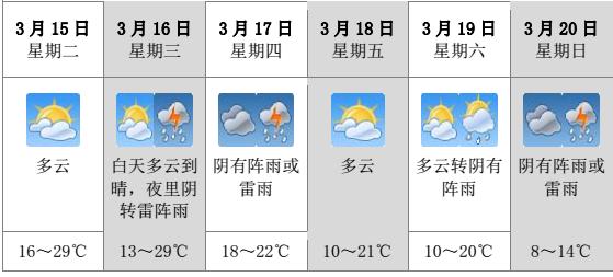 建德市气象台3月14日16时发布天气预报:今天夜里阴,部分地区有阵雨或雷雨,明天多云,后天白天多云到晴,夜里转阵雨或雷雨,东南风3级,明天最低气温15到16℃,明天最高气温28到29℃。