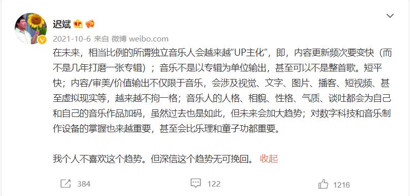 这也将五条人乐队变成了一个IP,产生了商业价值挖掘的可能。而周边产品也是乐队们有意或无意打造“IP”的一个落点。可以说,商业化水平的提升和传播平台的流变会持续地改变着独立乐队和音乐人的运营方式。知名乐评人迟斌也曾在微博上评论过这一现象,称之为“UP主化”。在他看来,未来独立音乐人内容、审美、价值输出不仅限于音乐,会涉及视觉、文字、图片、播客、短视频,甚至虚拟现实等;音乐人的人格、相貌、性格、气质、谈吐都会为他们和他们的音乐作品加码。
