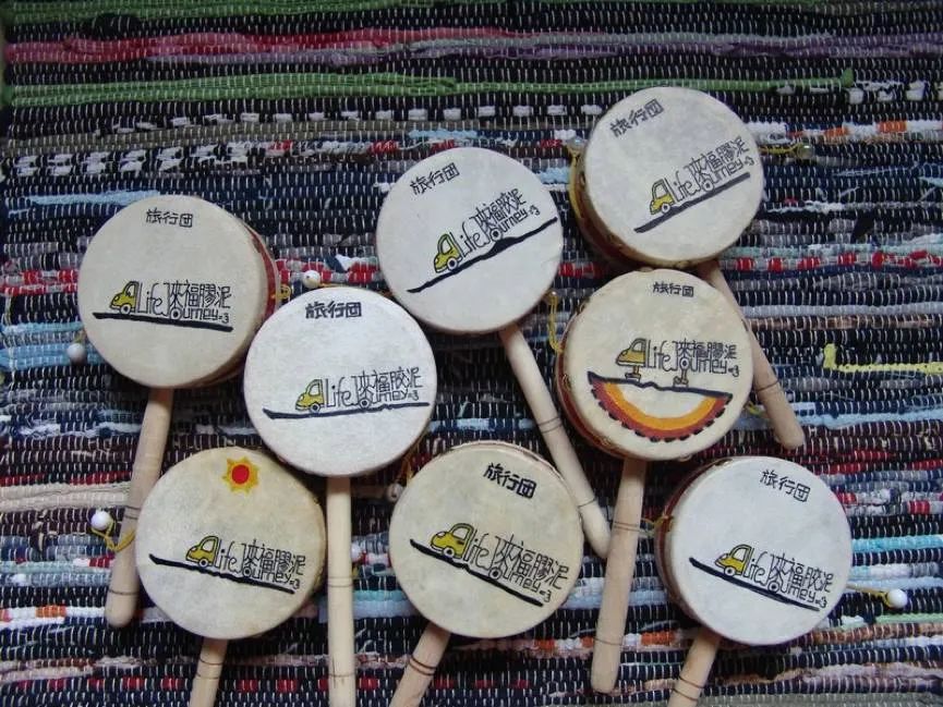 同样,丢莱卡乐队和塑料乐队也曾尝试用周边产品来完善自己独特的音乐风格。2019年,丢莱卡乐队和塑料乐队发布联合EP《小风波》,并将EP内的两首歌曲灌录在MP3中,配合数据线和一副音质全损的耳机在巡演现场售卖。MP3与低保真耳机的Lo-Fi组合放大了朋克乐队的风格特点,再佐以乐队自制广告中的调侃与自嘲,实现了乐队风格和态度向乐迷的传递。除此之外,乐队周边也常常充当乐队与乐迷交流沟通的媒介。在2008年,旅行团乐队在发行第一张唱片《来福胶泥》时,学设计出身的孔阳在北京的玩具市场批发了一百多个拨浪鼓,并把歌曲的内容、主题以及成员的动漫肖像画手绘在拨浪鼓上。毫无疑问,手绘作品最显著的特征是具有不可复制性,而乐迷也通过这些拨浪鼓感受到了旅行团在呈现作品时的诚意。后来,旅行团在采访中曾表示,“第一次巡演的现场有许多乐迷手摇着拨浪鼓看演出,场面很特别。”通过这一周边,旅行团和乐迷之间完成了一次直接的、切实的精神交流。