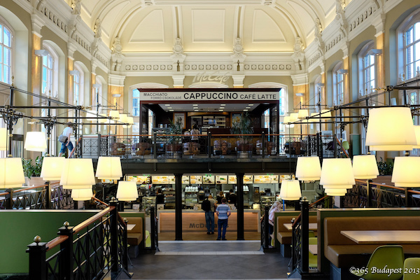 西火车站的老候车大厅建成于 1877年,百余年后,它改造成了匈牙利第一家麦当劳。这其中似乎富有一种象征意义:1988年正值东欧剧变前夕,美国文化已经悄然进入布达佩斯。然而,天花板上精美的金色拱形装饰,仿佛是永恒的;坐在长沙发上放声大笑的本地居民,也仿佛没有改变过。