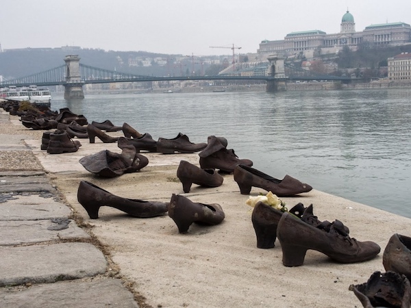 会堂的工作人员指引我去多瑙河边参观另一片遇难者纪念区。宏伟的国会大厦南侧,河岸上有60双铁鞋,纪念1945年1月8日夜间被迫走进冰冷河水的犹太人。