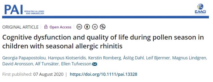 这项研究于2020年发表在Pediatr Allergy Immunol(儿科过敏免疫学)期刊上,文章名为“Cognitive dysfunction and quality of life during pollen season in children with seasonal allergic rhinitis”,中文译作“季节性过敏性鼻炎患儿花粉季节认知功能障碍与生活质量”。