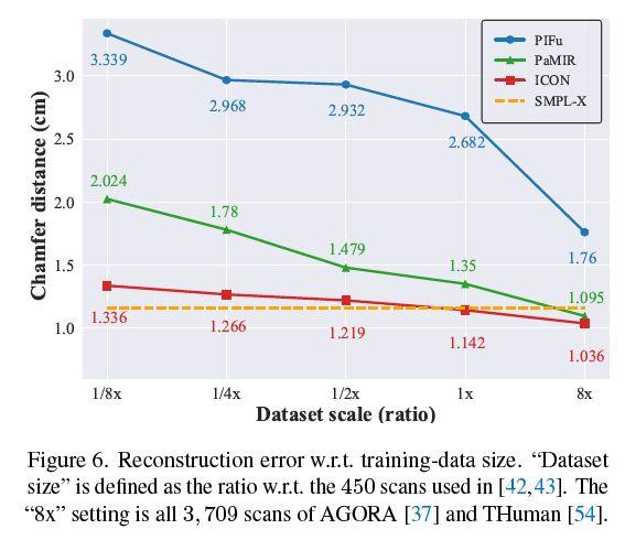 下面这张图证明了 ICON 的一个特别突出的优势,就是省钱。毕竟 RenderPeople 一个就几百块人民币,实在离谱。仅仅给 1/8 的训练数据(50 个 3D human scan),ICON 重建的质量就可以超过用接近 4000 个训练数据训出来的 PIFu,也超过了用 450 个数据训出来的 PaMIR。作为一个舍弃了 global CNN 的极其 local 的模型,ICON 对训练数据量确实不敏感。而恰恰就是这种钝感,对于提高三维人重建的姿势水平至关重要。