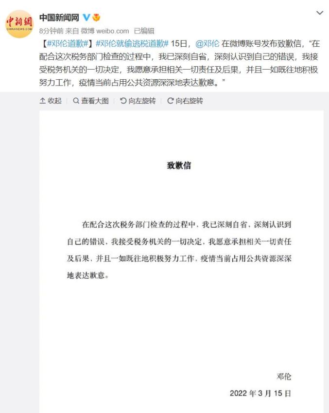15日,邓伦在微博账号发布致歉信,“在配合这次税务部门检查的过程中,我已深刻自省,深刻认识到自己的错误,我接受税务机关的一切决定,我愿意承担相关一切责任及后果,并且一如既往地积极努力工作,疫情当前占用公共资源深深地表达歉意。”