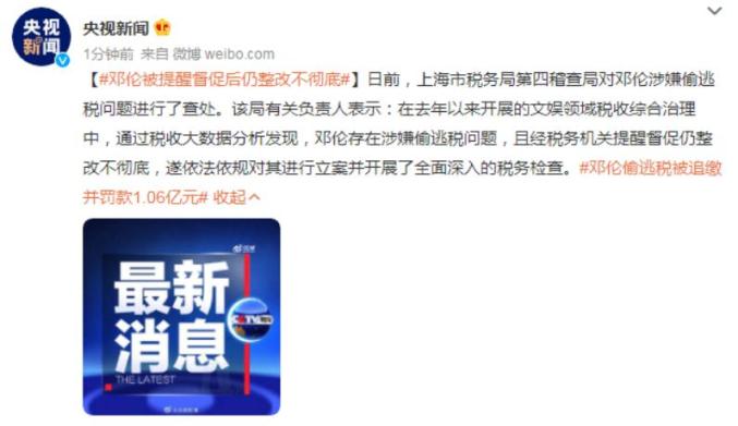 邓伦经税务机关提醒督促仍整改不彻底日前,上海市税务局第四稽查局对邓伦涉嫌偷逃税问题进行了查处。该局有关负责人表示:在去年以来开展的文娱领域税收综合治理中,通过税收大数据分析发现,邓伦存在涉嫌偷逃税问题,且经税务机关提醒督促仍整改不彻底,遂依法依规对其进行立案并开展了全面深入的税务检查。