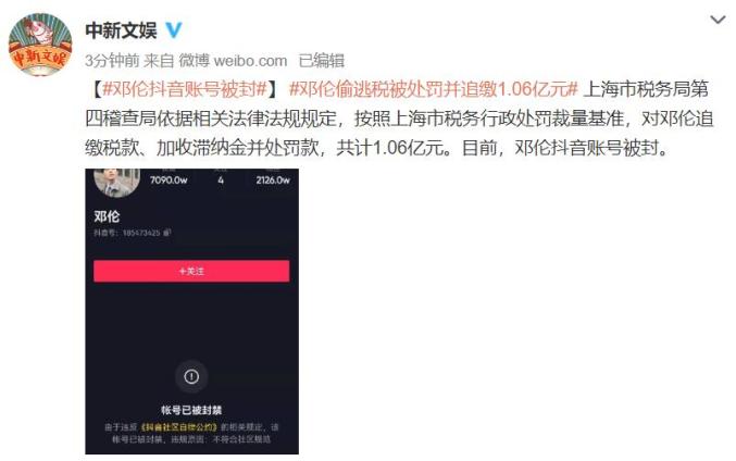 邓伦抖音账号被封上海市税务局第四稽查局依据相关法律法规规定,按照上海市税务行政处罚裁量基准,对邓伦追缴税款、加收滞纳金并处罚款,共计1.06亿元。目前,邓伦抖音账号被封。