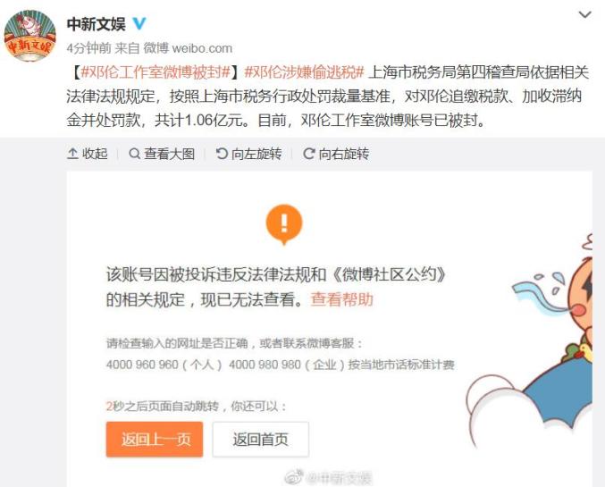 邓伦工作室微博被封上海市税务局第四稽查局依据相关法律法规规定,按照上海市税务行政处罚裁量基准,对邓伦追缴税款、加收滞纳金并处罚款,共计1.06亿元。目前,邓伦工作室微博账号已被封。