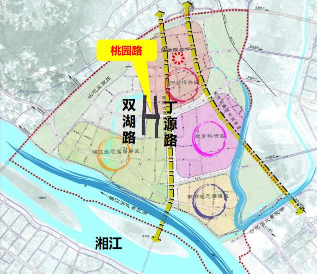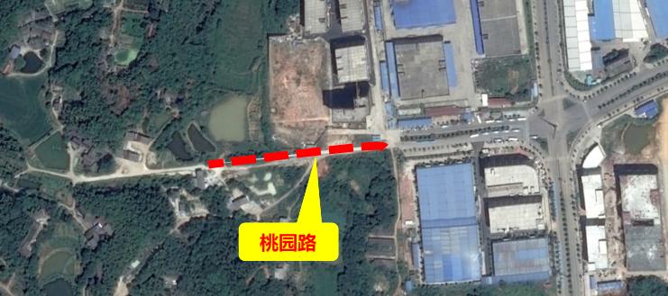 桃园路西接线起于丁源路、止于双湖路,全长250米,路幅宽度48米,为城市主干路。其主要建设内容包括道路工程、排水工程、交通工程、绿化工程、照明工程、海绵城市及管线综合等。