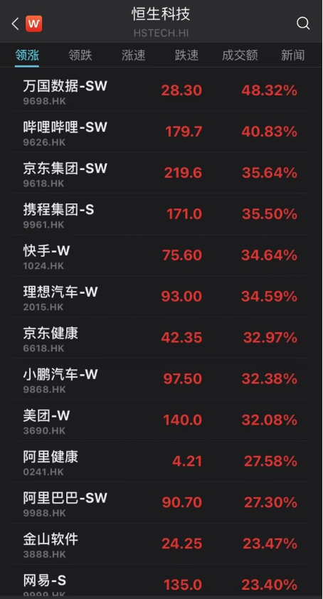 3月16日,港股主要指数大幅上涨。从恒生科技指数成分股来看,万国数据-SW涨超48%,哔哩哔哩-SW涨超40%,京东集团-SW、携程集团-S涨超35%,快手-W、理想汽车-W涨超34%,京东健康、小鹏汽车-W、美团-W均涨超32%。腾讯控股、阿里巴巴、美团、快手、百度集团等平台型公司大涨,市值单日合计增加超14000亿港币。