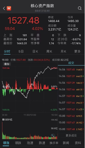 各种“茅”普遍大涨,截至收盘,核心资产指数涨4.02%。