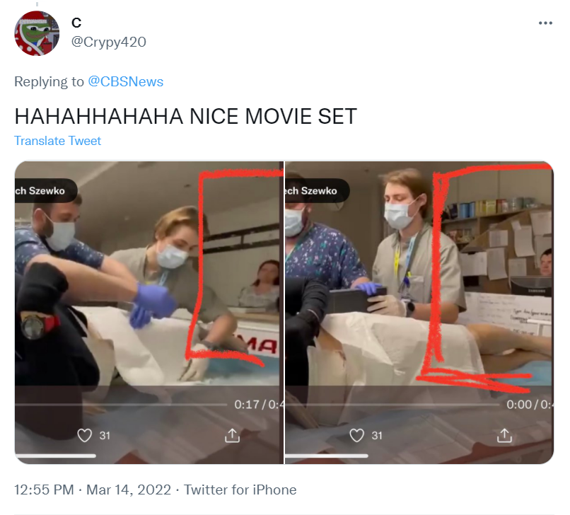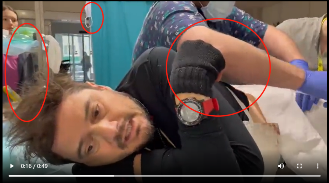 同一日,推特上广泛流传一段视频,据称是对受伤当事人的采访。视频中,一位自称胡安的男子躺在手术床上,侧对镜头,边接受治疗边描述事发经过:“我们穿过了伊尔平的第一座桥,打算去拍摄难民离开(的画面)。我们上了一辆车,有人提议带我们去另一座桥,然后我们过了一个检查站,他们就开始朝我们开枪。司机调转车头,他们还在继续射击——本来我们有两个人,我的朋友叫布伦特·雷诺(Brent Renaud)。他被击中了,被留在了后面。”